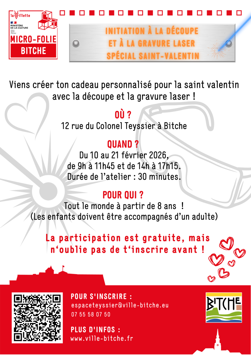 Dans cet atelier captivant et entièrement gratuit, nous plongerons dans le monde de la gravure et de la découpe laser, offrant aux enfants à partir de 8 ans, mais aussi aux adultes et aux couples, une expérience immersive et créative pour célébrer la Saint-Valentin.