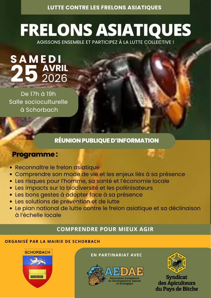 Face à la progression du frelon asiatique sur notre territoire, la commune de Schorbach organise une réunion publique d’information ouverte à tous.