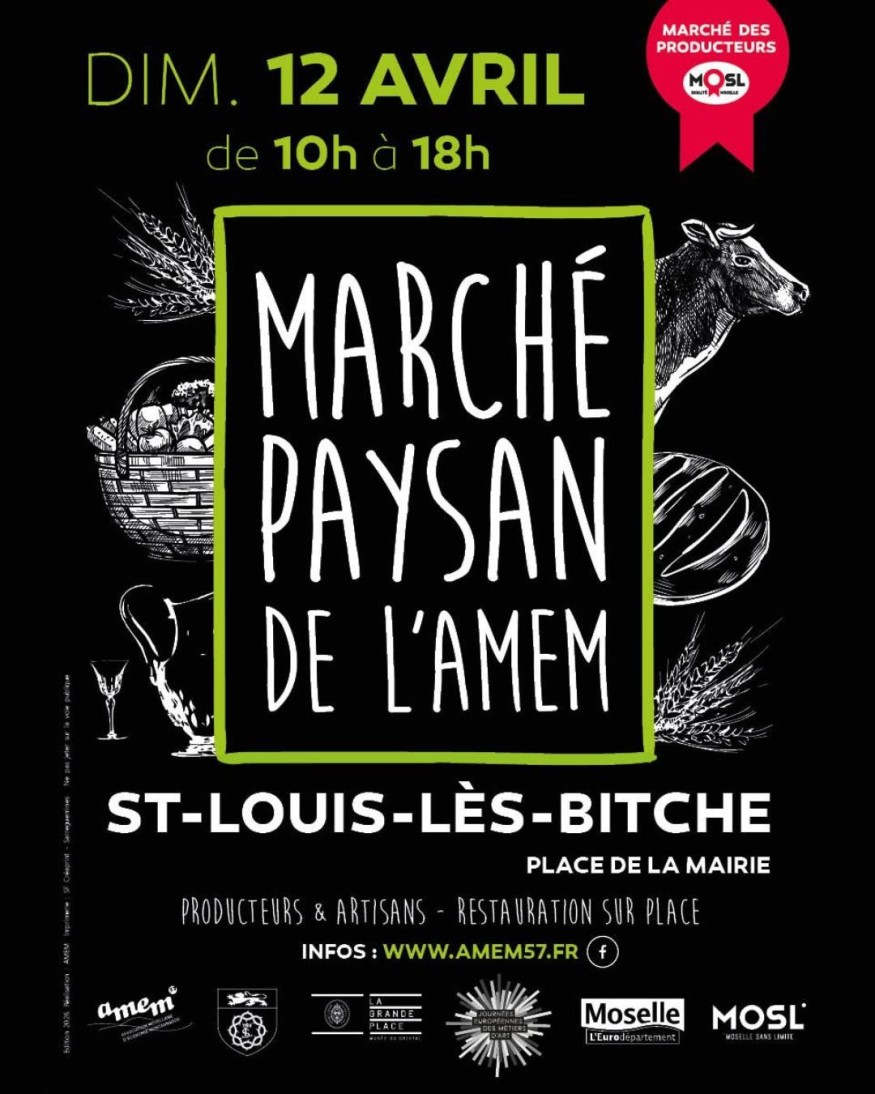 Le Marché Paysan de l'AMEM vous donne rendez-vous le dimanche 12 avril 2026, de 10h à 18h, sur la Place de la Mairie. Un évènement organisé en collaboration avec la commune de St-Louis-Lès-Bitche et soutenu par le Conseil Départemental de la Moselle et Moselle Attractivité.