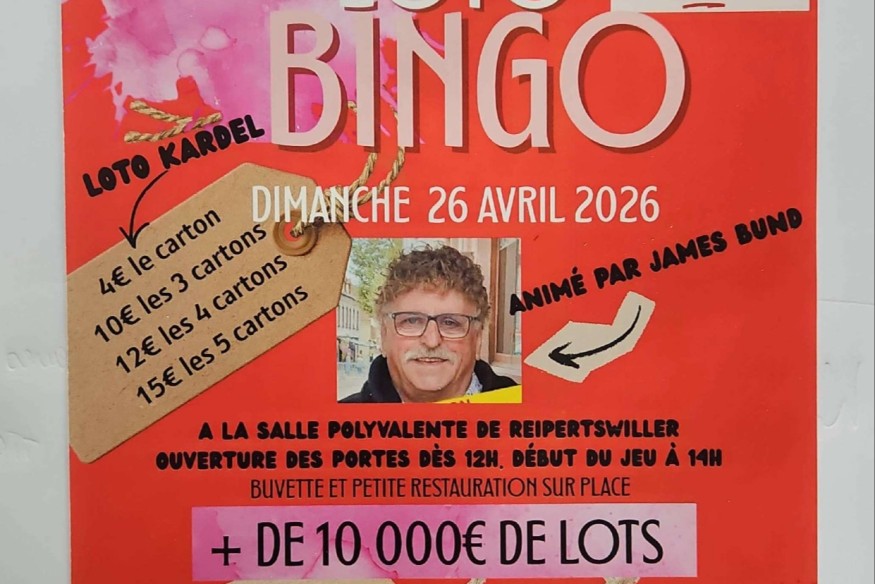 Événement : Loto BingoDate : Dimanche 26 avril 2026 Lieu : Salle polyvalente de Reipertswiller 67340Horaires : Ouverture des portes : 12h Début du jeu : 14h Animation : Assurée par James B...