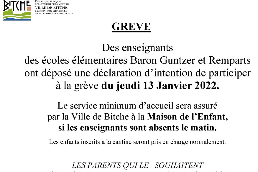 Les enseignants des écoles élémentaires Baron Guntzer et Remparts ont répondu à l’appel et participeront à ce mouvement de grève ce jour. Cependant, le service minimum d’accueil sera assuré par la Ville de Bitche à la Maison de l’Enfant, dans le......