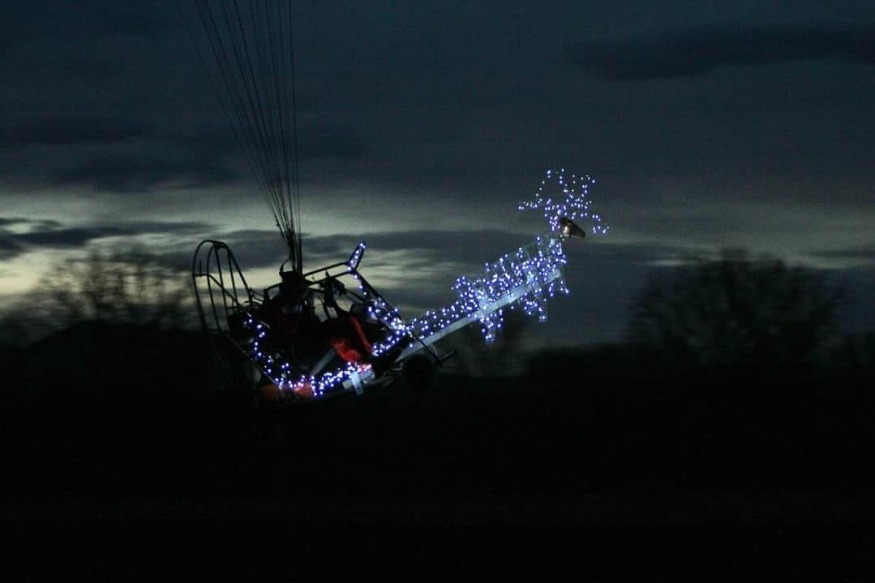 C’est dans le petit village d’Elsenheim en Alsace que Luc Warth, directeur de l’Ecole d’Alsace Paramoteur, se déguise en Père Noël et a modifié son engin pour lui donner des allures de traineau. Cela fait maintenant plusieurs années qu’il vole à la période de Noël dans ces conditions, mais il modifie chaque année son traineau. L’année dernière, on ne comptait qu’un seul renne, cette année il y en a 4 !