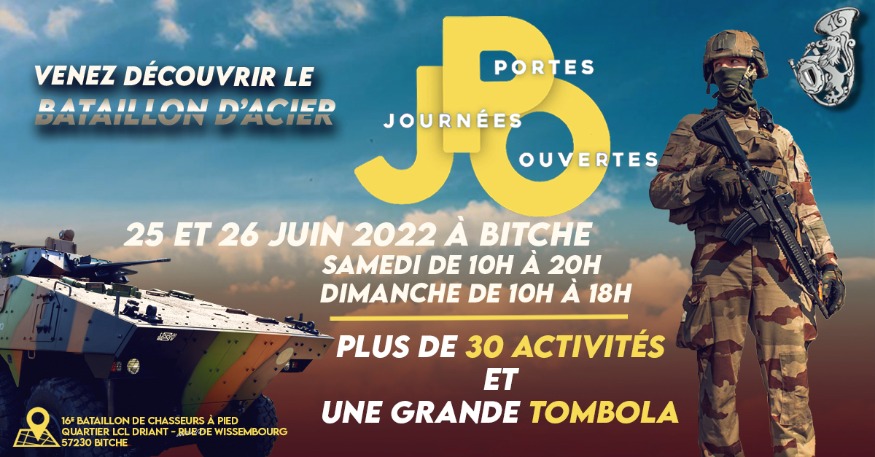 Les 25 et 26 juin prochain, le 16ème Bataillon de Chasseurs à Pied vous ouvre leurs portes ! Vous souhaitez découvrir le monde militaire ou simplement visiter le Bataillon ? Vous pourrez venir en famille ou entre amis de 10h à 20h pour le 25 juin et de 10h à 18h pour le 26 juin !