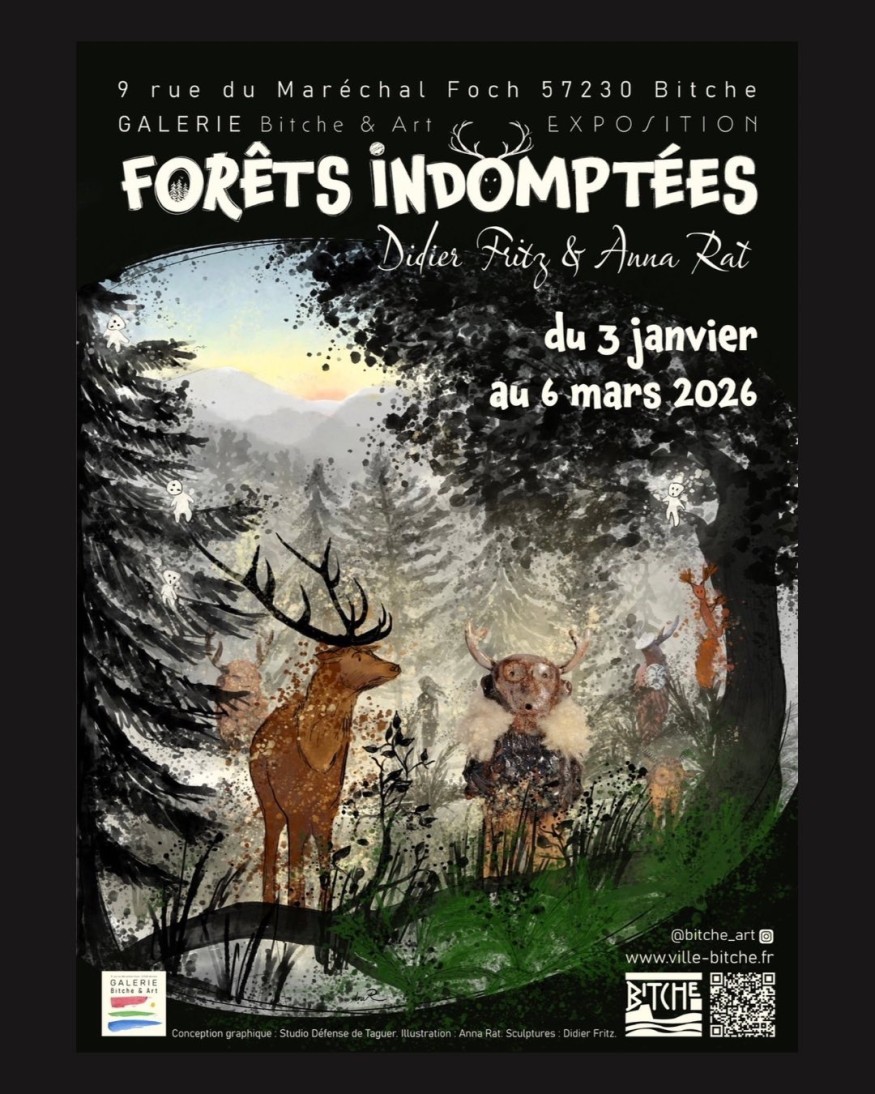 Du 3 janvier au 6 mars 2026, la Galerie Bitche & Art propose une exposition originale et sensible intitulée Forêts Indomptées, réunissant les travaux de Didier Fritz et Anna Rat, deux artistes des Vosges du Nord aux univers complémentaires.