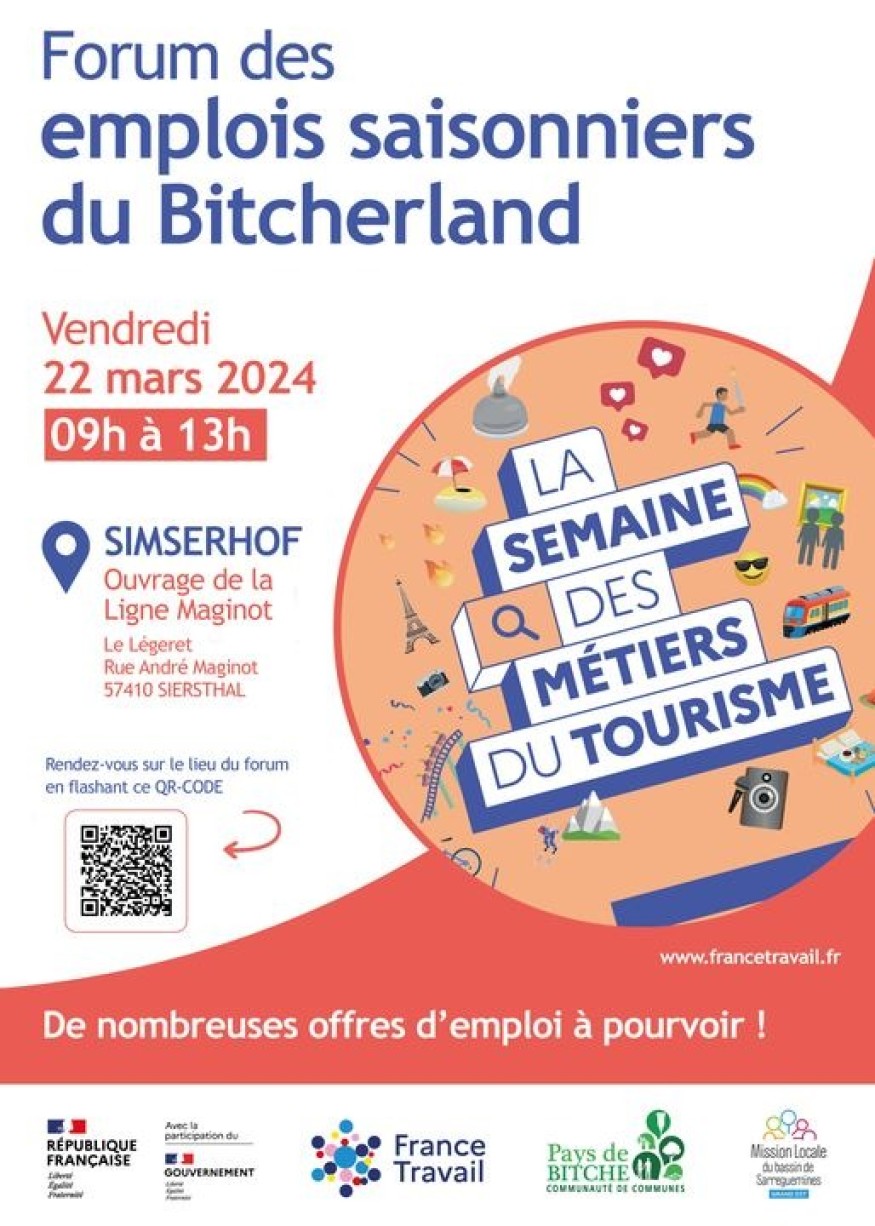A l'initiative de l'agence France Travail Sarreguemines et en partenariat avec la Communauté de Communes du Pays de Bitche, ce forum des emplois saisonniers du Bitcherland se déroulera au Simserhof ce vendredi 22 mars de 9h à 13h.