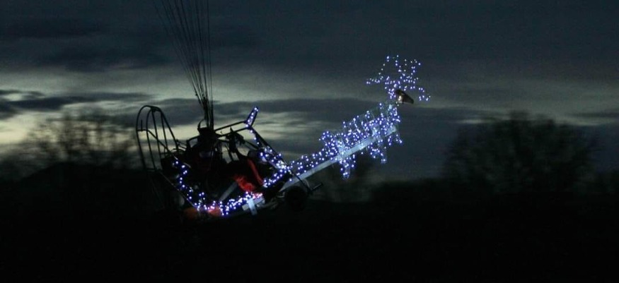 C’est dans le petit village d’Elsenheim en Alsace que Luc Warth, directeur de l’Ecole d’Alsace Paramoteur, se déguise en Père Noël et a modifié son engin pour lui donner des allures de traineau. Cela fait maintenant plusieurs années qu’il vole à la période de Noël dans ces conditions, mais il modifie chaque année son traineau. L’année dernière, on ne comptait qu’un seul renne, cette année il y en a 4 !