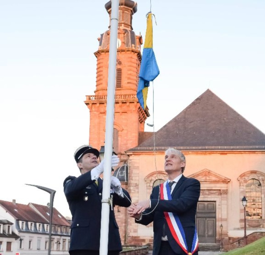 Un fanion bleu et jaune a été hissé à côté des drapeaux français et européen. Ce fanion restera en place jusqu'au retour des troupes envoyées en Côte d'Ivoire.