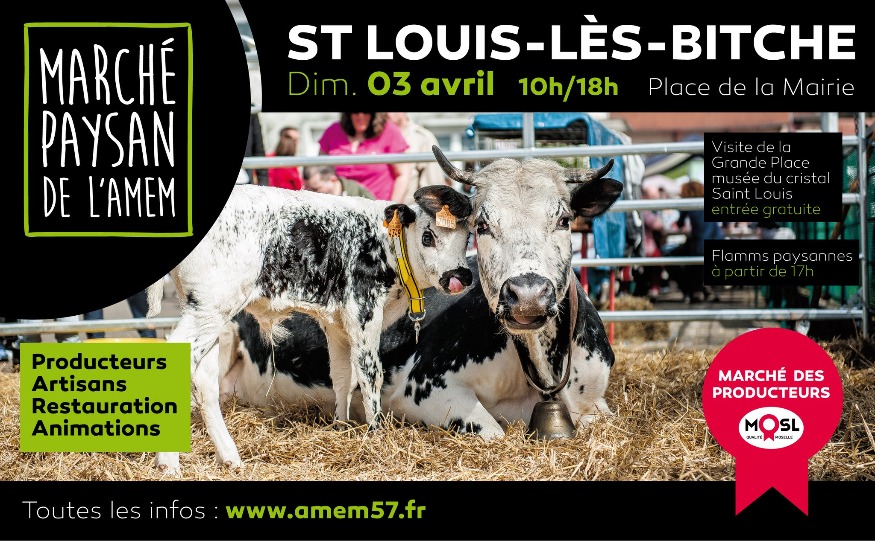 Organisé en partenariat avec la Commune de Saint-Louis-Lès-Bitche la Grande Place musée du cristal Saint Louis et avec le soutien du Conseil Départemental de la Moselle et Moselle Attractivité, le marché paysan de l’AMEM se tiendra sur la place de la Mairie ce dimanche 3 avril 2022 de 10h à 18h.