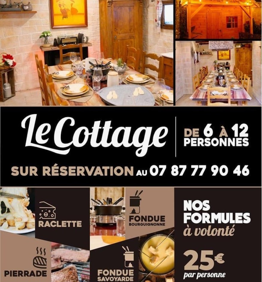 Sandrine a aménagé rien que pour vous un Cottage à l'arrière de son café, une pièce ambiance chalet ou vous et vos proches pourrez en toute intimité déguster raclette, fondue, pierrade à volonté ! Le Cottage est disponible uniquement sur réservation, midi et soir pour 6 à 12 personnes au tarif de 25€ par personne hors boissons (avec des produits frais achetés le jour même). Pour réserver contactez Sandrine au 07 87 77 90 46. Idéal pour une soirée en famille, entre amis ou même pour un repas professionnel.