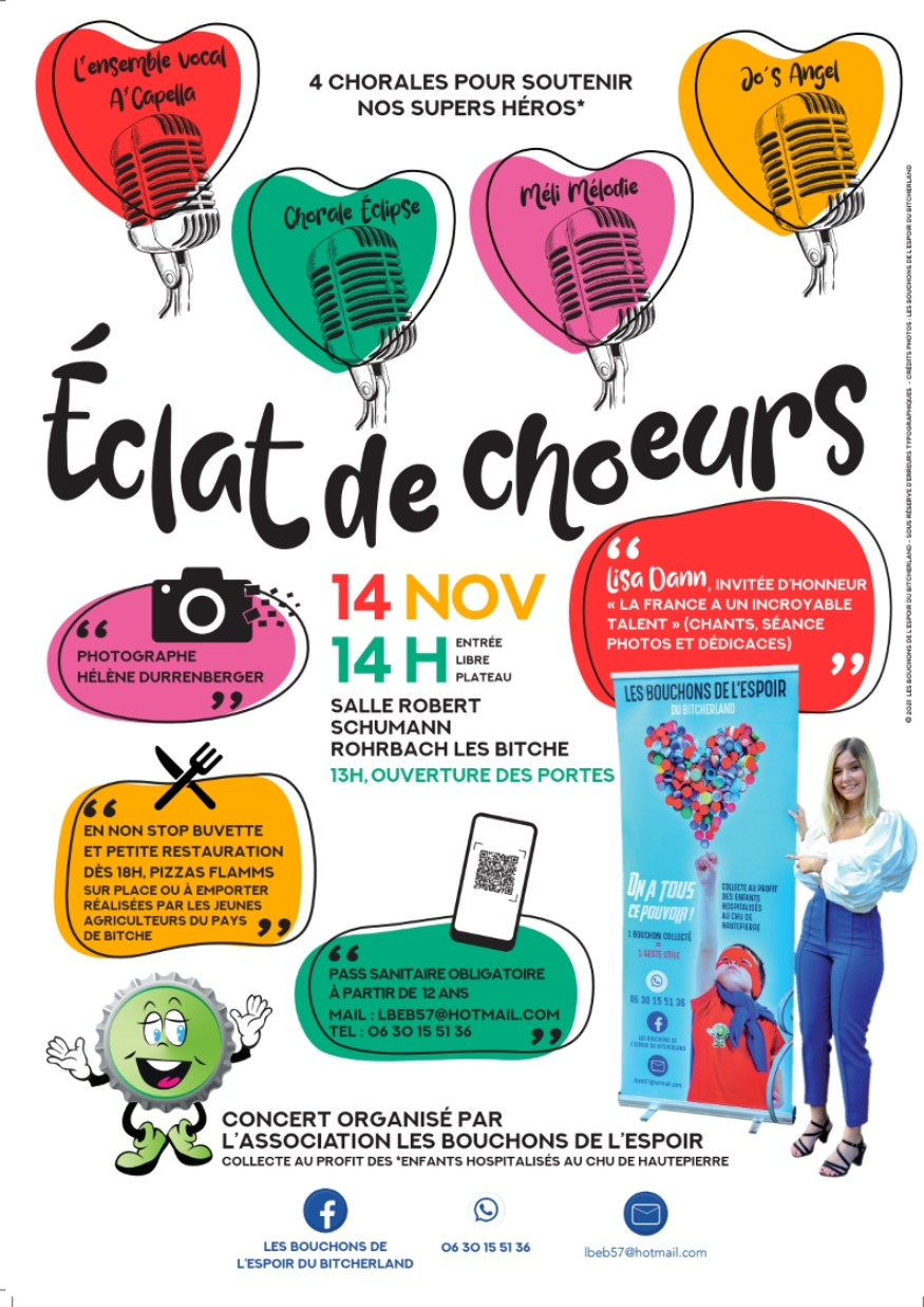 Le dimanche 14 novembre, vous pourrez assister à un concert regroupant 4 chorales organisé par l’association, de 14h à 21h. Vous retrouverez la Chorale Eclipse de Rahling, les Jo’s Angels de Volmunster, la Chorale Méli Mélodies et l’Ensemble Vocal A’Capella de Grosbliederstroff. Se rajoutera la jeune Lisa Dann, l’invitée d’honneur de l’événement. Elle a participé à La France a un Incroyable Talent. Vous pourrez la découvrir sur scène mais aussi à une séance photo et de dédicaces.