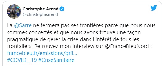 En ce jeudi après-midi l'institut Robert Koch n'a pas placé la région Grand-Est en zone à risques, ce qui ne saurait tarder malheureusement, ce qui signifie que vous pouvez vous déplacer librement en Allemagne.Le député mosellan Christophe Arend, président du groupe d’amitié franco-allemande de l’Assemblée nationale affirmait ce matin sur les ondes de France Bleu Lorraine que La Sarre ne fermerait pas ses frontières.