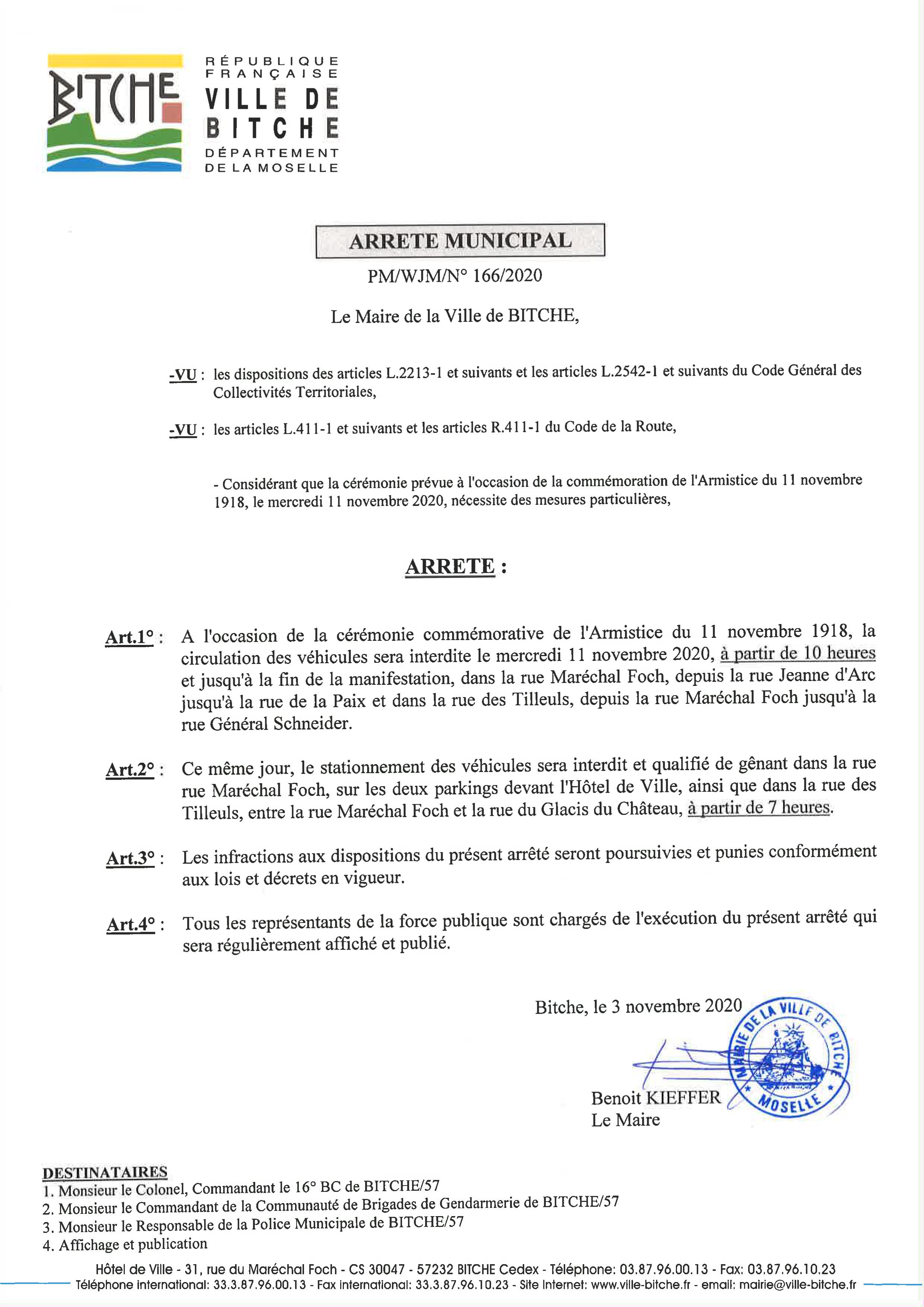 En vue de la cérémonie commémorative de l'Armistice du 11 novembre 1918, demain matin à partir de 7 heures il sera interdit de stationner aux abords du Monument aux morts devant l'Hôtel de Ville de Bitche et il sera interdit d'y circuler à partir de 10 heures comme nous l'indique ci-dessous l'arrêté municipal de la Ville de Bitche.