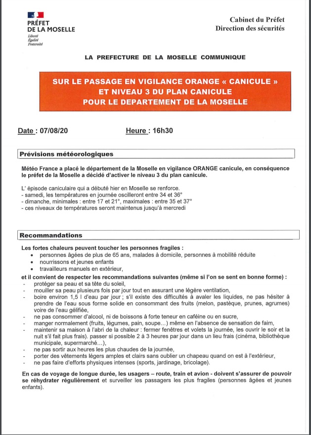 Météo France a placé hier le département de la Moselle en vigilance ORANGE canicule, en conséquence le préfet de la Moselle a décidé d'activer le niveau 3 du plan canicule dont voici le communiqué :