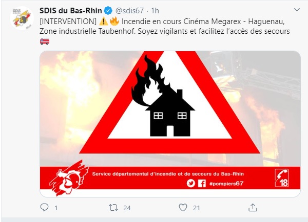 Vers 8h20 ce matin, les sapeurs pompiers du Bas-Rhin ont été appelés pour éteindre un incendie qui s'est déclaré dans la salle n°8 du cinéma MEGAREX à Haguenau. Vers 10h le feu à été maîtrisé et aucune victime n'est à déplorer.