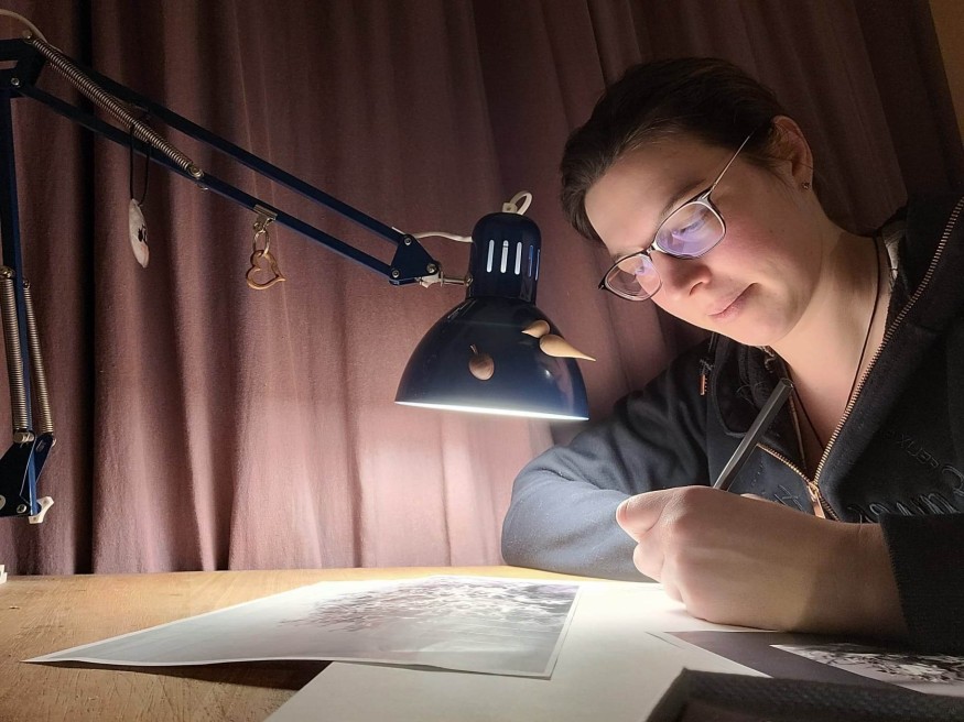 Depuis 2019, elle s’est recentrée sur le dessin au crayon. « Quand vous devez vous occuper de vos enfants, les pinceaux ont le temps de sécher et quand on y revient il faut tout nettoyer avant de pouvoir continuer. Avec le crayon, on peut se remettre à son dessin dès qu’on a un moment, que ce soit de manière rapprochée ou non et ce sans la contrainte du nettoyage » ironise-t-elle. Surtout qu’elle dispose rarement de temps pour s’adonner à sa passion. Le processus de réalisation est de ce fait souvent très long et impossible à quantifier en heures de travail, qui semblent, au vu des détails, effectivement innombrables !