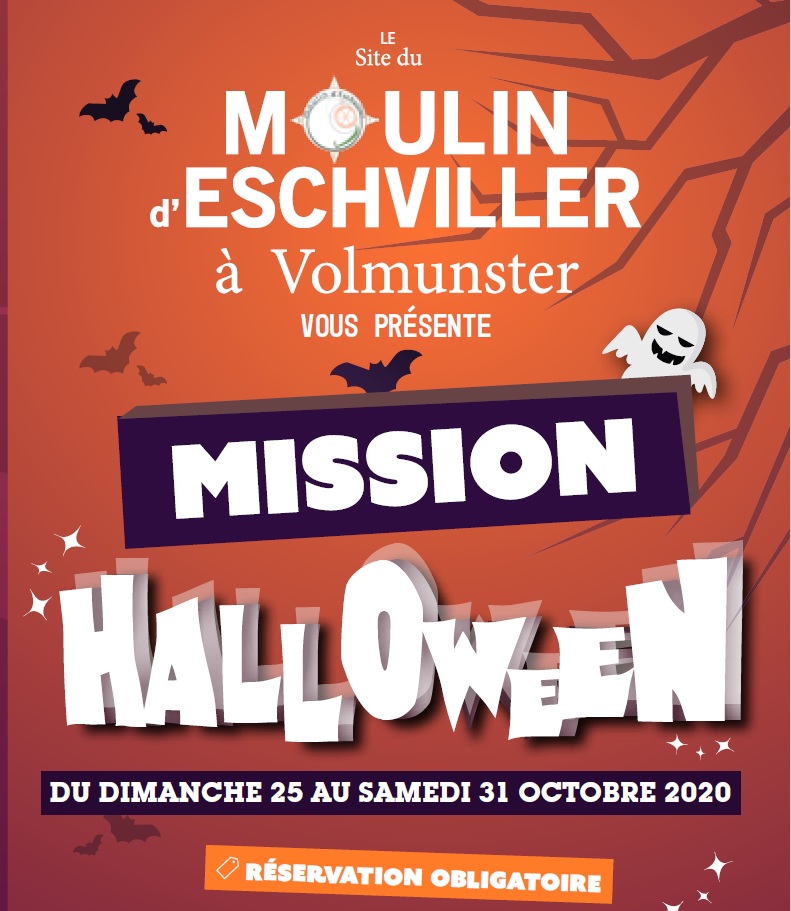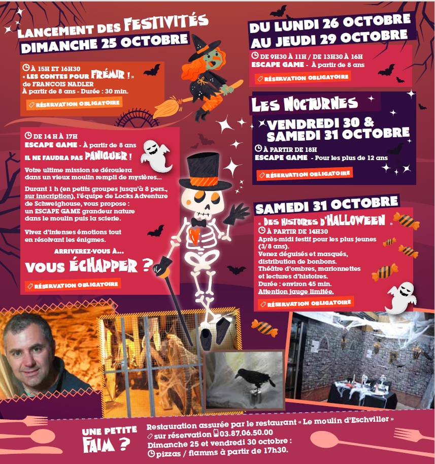 Du dimanche 25 au samedi 31 octobre dans le cadre d'Halloween, le site du moulin d'Eschviller va se transformer en Escape Game grandeur nature pour toute la famille. Durant cette période vous pourrez pendant une heure environ résoudre toutes les énigmes à travers le vieux moulin et jusque dans la scierie pour réussir à vous échapper. Mais pas seulement puisque pour Halloween le moulin d'Eschviller vous propose un programme bien chargé, lancement des festivité le dimanche 25 octobre avec à partir de 15h les contes pour Frémir de François NADLER, l'Escape Game aura lieu de 14h à 17h ainsi que du lundi 26 au jeudi 29 octobre de 9h30 à 11h et de 13h30 à 16h et le vendredi 30 et samedi 31 en Nocturne à partir de 17h. Le samedi pour les plus petits (à partir de 3ans) à partir de 14h30 une après-midi festive est organisée avec distribution de bonbons, théâtre d'ombre, marionnettes et lecture de contes. Mais ATTENTION pour pouvoir participer à ses activités il faudra vous inscrire soit par téléphone au 03 87 96 76 40 au par mail resa@moulindeschviller.fr Tarif unique de 5€ par personne pour l'escape game. Les autres animations sont gratuites.